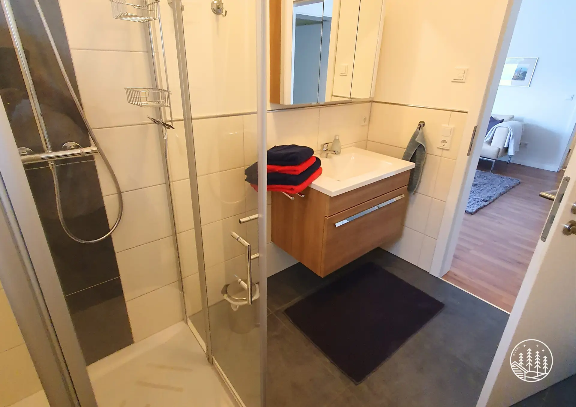Das Badezimmer ist hell, funktional und komfortabel gestaltet. Es verfügt über eine Dusche, ein WC sowie einen geräumigen Spiegelschrank, der ausreichend Platz für Ihre Utensilien bietet.